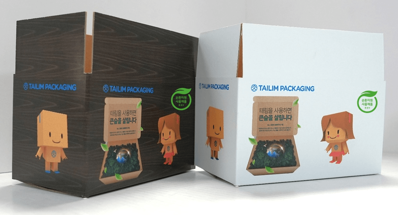 글로벌세아그룹의 경영 모토인 ESG 경영실천을 강화하고 있는 태림포장의 친환경 캐릭터 ‘태리미’와 ‘원다니’가 새겨진 골판지 상자[사진제공:태림포장]