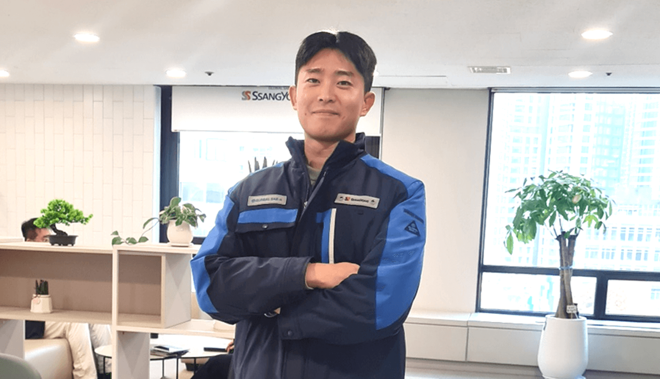 쌍용건설 사원이 새로운 통합 근무복을 입고 있는 모습.[사진:글로벌세아]